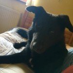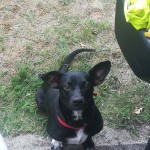 Schwarzer Hund mit grune halcband. Mittel hohe. Weiser punkt neben hende, auf den fusen hat er auch weis.