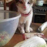 Eine kleine, einjährige, weiße mit grauen Flecken am Kopf Katze.
