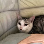 Der kastrierte Kater ist grau getigert mit weiß, ca. schätzungsweise 1 bis 2 Jahre alt, hat ein Chip