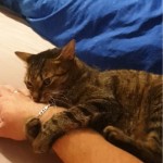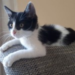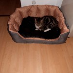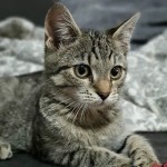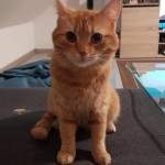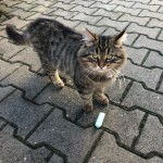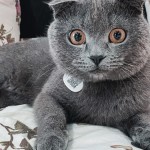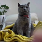Franek Alvin ist eine graue britische Katze. Er hat ein rotes Halsband mit einer Glocke. Er ist scheu.