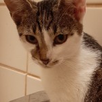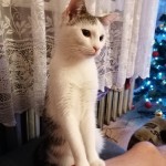 Ein weißes Kätzchen mit grauen Flecken auf dem Rücken. Das Kätzchen ist 10 Jahre alt. Am Tag ihres Verschwindens hatte sie ein rosa Halsband mit einer Telefonnummer.