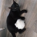 Schwarze Katze. Ziemlich klein mit dunkel grün Halsband.