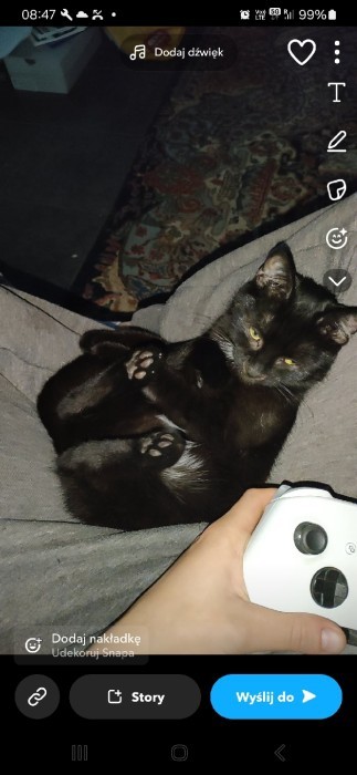 Black small Cat with white spot on neck and stomach