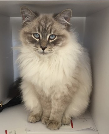 White fluffy and scruffy coat, small round blue tabby point face, grey legs, grey tail. Distinctive meow. Blue eyes quite close together.
