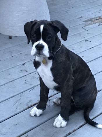 Klara, ciemnopregowana z biała strzałka na głowie i biała kufa. Ma na sobie łańcuszek srebrny.