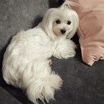 Biały maltańczyk, krótki włos, ubrana w różowe szelki i smycz