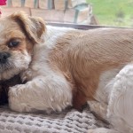 Mały, ufny piesek. Samiec po sterylizacji. Biało-brązowy z obecnie krótkim włosem. Na ogonie dłuższa sierść.