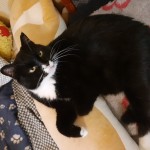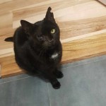 Dorosła kotka, czarne futro, biała klatka piersiowa i białe łapki (skarpetki), ma białą plamkę na nosie i pod nosem.