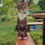 Dwuletni kot, o burym umaszczeniu. Biały krawat i skarpetki. Prawdopodobnie na szyi ma lokalizator
