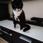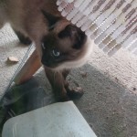 Młody, niewielki kot, ciemnobrązowy z niewielkim białym krawatem na szyjce. Reaguje na imię Brownie (Brauni) i na cmokanie.