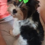 Mała, dwuletnia suczka rasy Biever Yorkshire Terrier, wysokości ok 20 cm, maści czarno-biało-złotej, krótko obcięta.