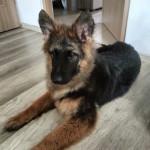 Roczny, podpalany, długowłosy owczarek niemiecki. Ma charakterystyczną czarną plamkę na języku. Piesek ma na sobie skórzaną obrożę z metalowymi dodatkami.