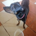Pinczer krótkowłosy bez ogonka czarny podpalany miał czerwoną obrożę z okrągłym identifikatorem na którym było imię (PIMPOLL) i numerem telefonu
