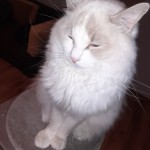 imię Hrabia wiek 8 lat. Długowłosy duzy kot brudniobiały z ciemnymi łapkami, pyszczkiem i ogonem, jest duzy i ciężki , puchaty , bardzo spokojny i ufny. charakterystyczne błękitne oczy , rasa Ragdoll