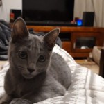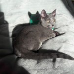 Kot szaroniebieski o zielonych oczach nieufna w stosunku do obcych. Kotka wyszła z domu Bez obroży.