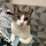Krótkowłosy czarny kot, wykastrowany z białą plamką na brzuchu i kilkoma białymi włoskami na szyi. Bardzo tulaśny i wygadany, charakterystycznie mrauczy.