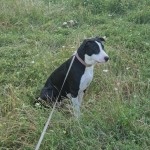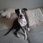 Czarna z białym akcentem. W typie amstafa. Spokojna, może być przestraszona. Nie ma na sobie obroży.