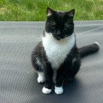 Kot czarno biały z charakterystyczną białą kropką na ogonie