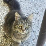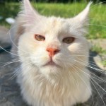 Biały kot, bursztynowe oczy, obroża niebieska moro z odblaskami. Młody i smukły. Reaguje na gwizdanie i cmokanie ustami