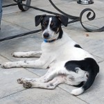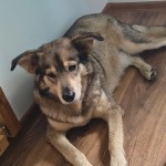 Starszy pies, średniego wzrostu. Miał obrożę niebieską w kolorowe wzorki (żółto-pomarańczowe.