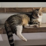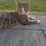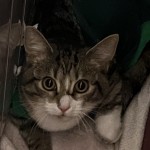 Kot domowy, wykastrowany. Umaszczenie: biało-bury (pręgowany), biała pierś i białe łapki. Najbardziej charakterystyczna cecha: nosek pół różowy, pół biały (wyraźny podział kolorów). Dodatkowo na tylnej lewej łapce, na białej sierści, ma małą czarną plamkę. Oczy żółto-zielone. Średniej wielkości,...