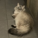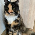 Trójkolorowa z długą sierścią z białym krawatem pod brodą z puchatym ogonem, więcej ciemnobrązowej sierści. Reaguje na imię Chanel i zapewne jest przestraszona.