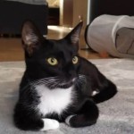 Czarny z białymi łapkami, krawatką i plamką pod nosem