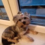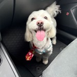 Biały nieduży piesek. Wygląda jak chmurka. Obecnie raczej krótko obcięty. Przy oczkach ma ciemniejsze zacieki od łez. Na szyi ma kolorową obrożę z zawieszką z numerem telefonu. Jest bardzo łagodny i ufny
