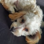 Maltipoo bialy z uszami biszkoptowymi ,tyłozgryz. Był ubrany w czarna kurteczke.przerazony ucieka.