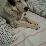suczka wielkości do kolana ,biała w czarne cętki,czarna plama przy ogonie,bardzo łagodna