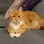 Rudy, 11 letni, średniej wielkości z ruda plamka na lapce, kastrowany, białe skarpetki na tylnych łapkach dłuższe, białe futerko pod noskiem, białe pod szyją i częściowo na brzuchu