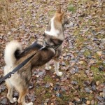 Kolor czekoladowo biały, pies miał na sobie szelki