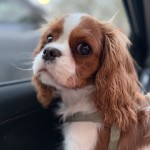 Szczeniak blenheim 6 msc suczka Cavalier Spaniel bardzo ufna i towarzyska do ludzi i zwierząt z przepukliną pępkową z bardzo regulaną strzałką na mordce kończącą się na głowie.