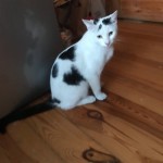 Biały kocur Edek z czarnym ogonem, czarnymi łatami między uszami, czarnymi łatami na grzbiecie po prawej stronie(jedna w kształcie serca). Zielono-bursztynowe oczy.