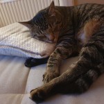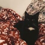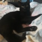 Czarna 10-letnia kotka, niezbyt duża, dość pulchna, fałda brzuszna po sterylizacji, chorobowo zmienione lewe oko po kocim katarze, gołe pięty. Kotka niewychodząca, nieufna wobec obcych