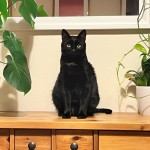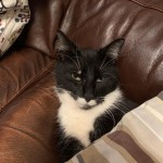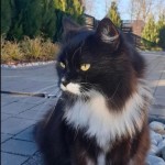 Wiek 3 lata. Kocurek. Czarny białe górne wargi i dolna prawa. Biały przód od szyi po brzuch oraz białe wszystkie końce łapek. Potrafi otwierać drzwi wskakując na klamkę.