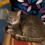 Młody kot, ok. 9 m-cy adoptowany ze schroniska. Bury. Może reagować na imię Kostek.