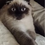 Biały kocur Edek z czarnym ogonem, czarnymi łatami między uszami, czarnymi łatami na grzbiecie po prawej stronie(jedna w kształcie serca). Zielono-bursztynowe oczy.