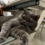 Leonek, kocur rasy brytyjskiej krótkowłosej, o szaroniebieskim futerku i bursztynowych oczach. Przyjazny, ale może być ostrożny wobec obcych