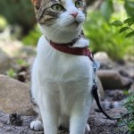 8 miesięczny samiec, po kastracji, biały krawat, białe łapy, poza tym czarno-szaro-brązowy. Na szyi ma szarą obrożę przeciw kleszczom.