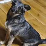 Mała suczka z krótką sierścią koloru czarno brązowo burego. Jasne łapki
