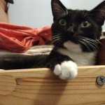 Kotek czarny z biała plamka na szyi i na brzuszku.