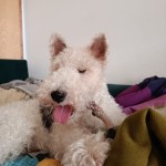 Pies 4 lata foksterier szorstkowłosy trikolor czerwona obroża