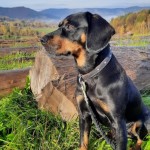 mieszaniec w typie gończy, czarny podpalany, średniej wielkości waży ok.15 kg ma 8 lat, mordka lekko posiwiała