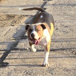 Krótka sierść, biało ruda, białe pazury, średnia wielkość, ma na sobie szare szelki i obrożę z pomarańczowym znacznikiem. Bardzo przestraszona