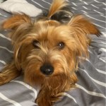 czarny podpalany York ma na imię Laki ma niebieską obroże z imiennikiem i numerem telefonu, jest energiczny i ma przyjazne nastawienie do ludzi , ma też częściowe braki w uzębieniu