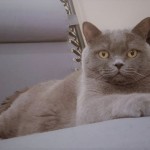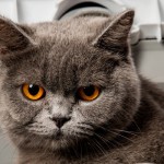 Kotka brytyjska krótkowłosa. Szare, srebrne krótkie futro, bursztynowe, okrągłe oczy. kot z widoczną nadwagą.