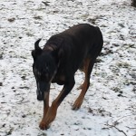 Stara suczka dobermanka wabi się Lola. Bardzo łagodna i nieufna.