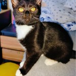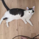 kocica czarnobiała z czarna plamka na pyszczku, ufna bez obrozy