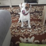 Jack Russel Terrier ok 8 kg Biały z brązową latka na oku.